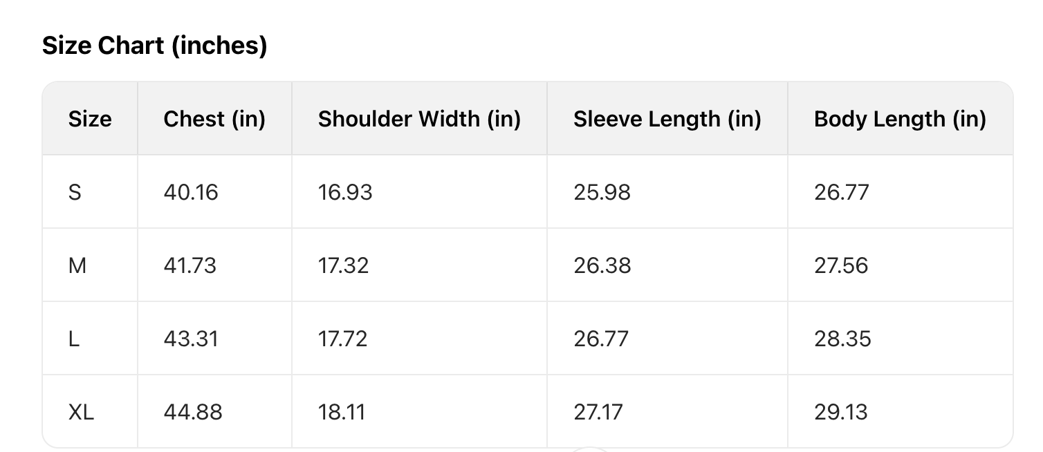 Every product page includes a detailed size chart for accurate measurements.