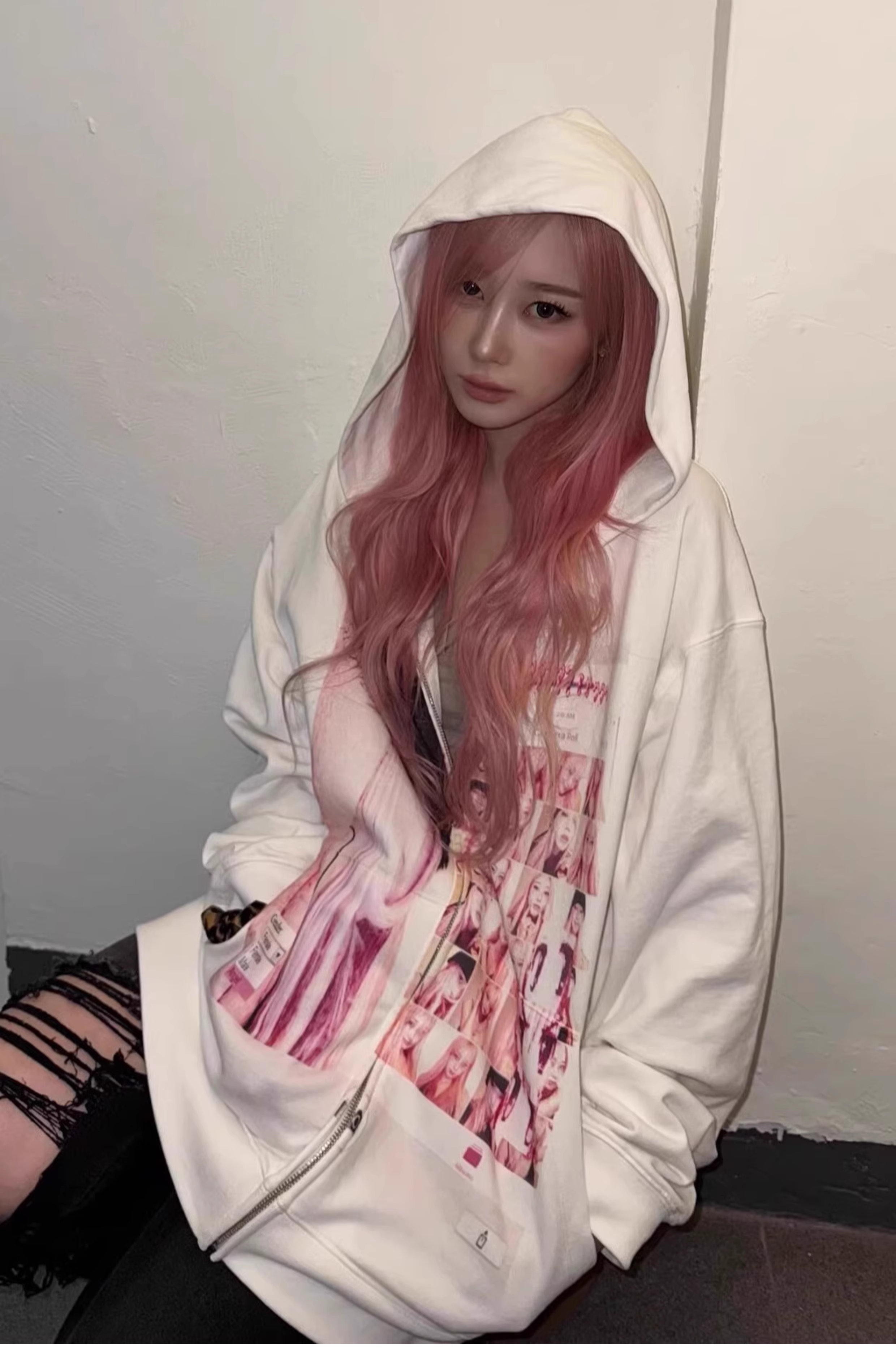 Aespa Giselle Style White Zipper Hoodie Jacket - Fan-Favorite "Pain Shirt," Worn by Giselle, A Must-Have!💗