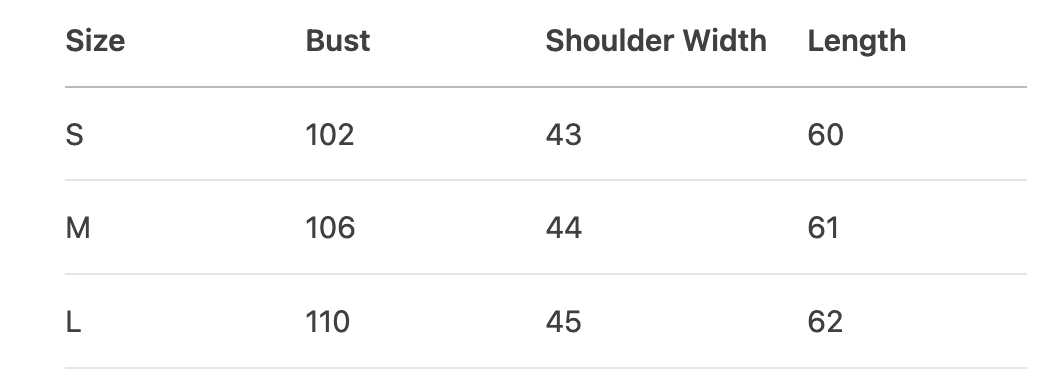 • Shoulder Width: Seam to seam across back