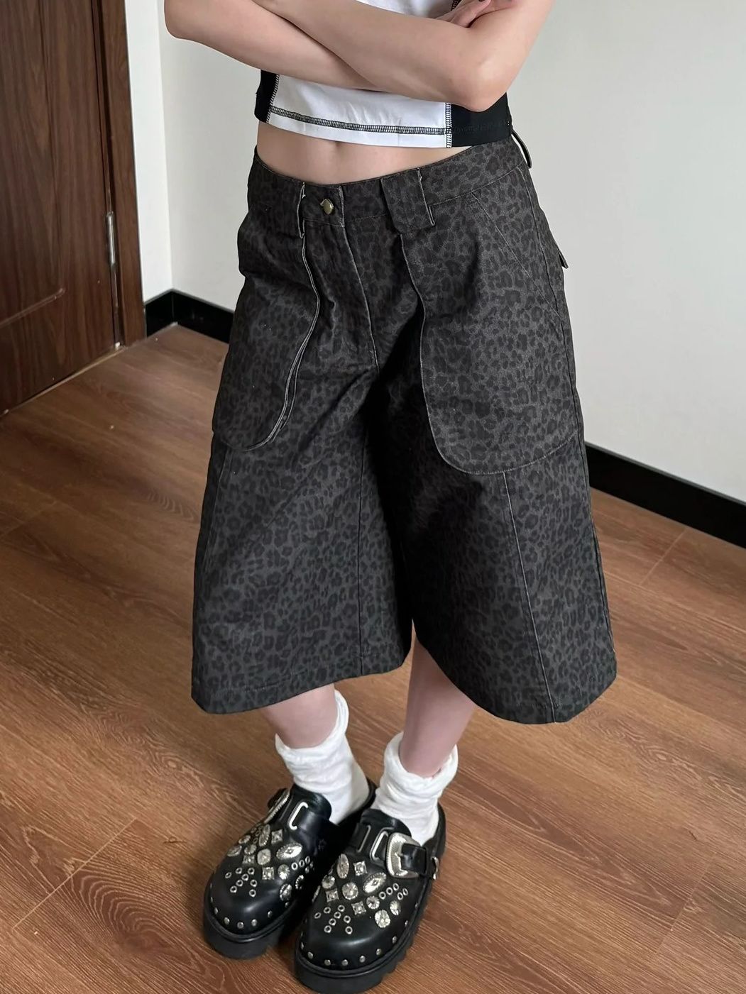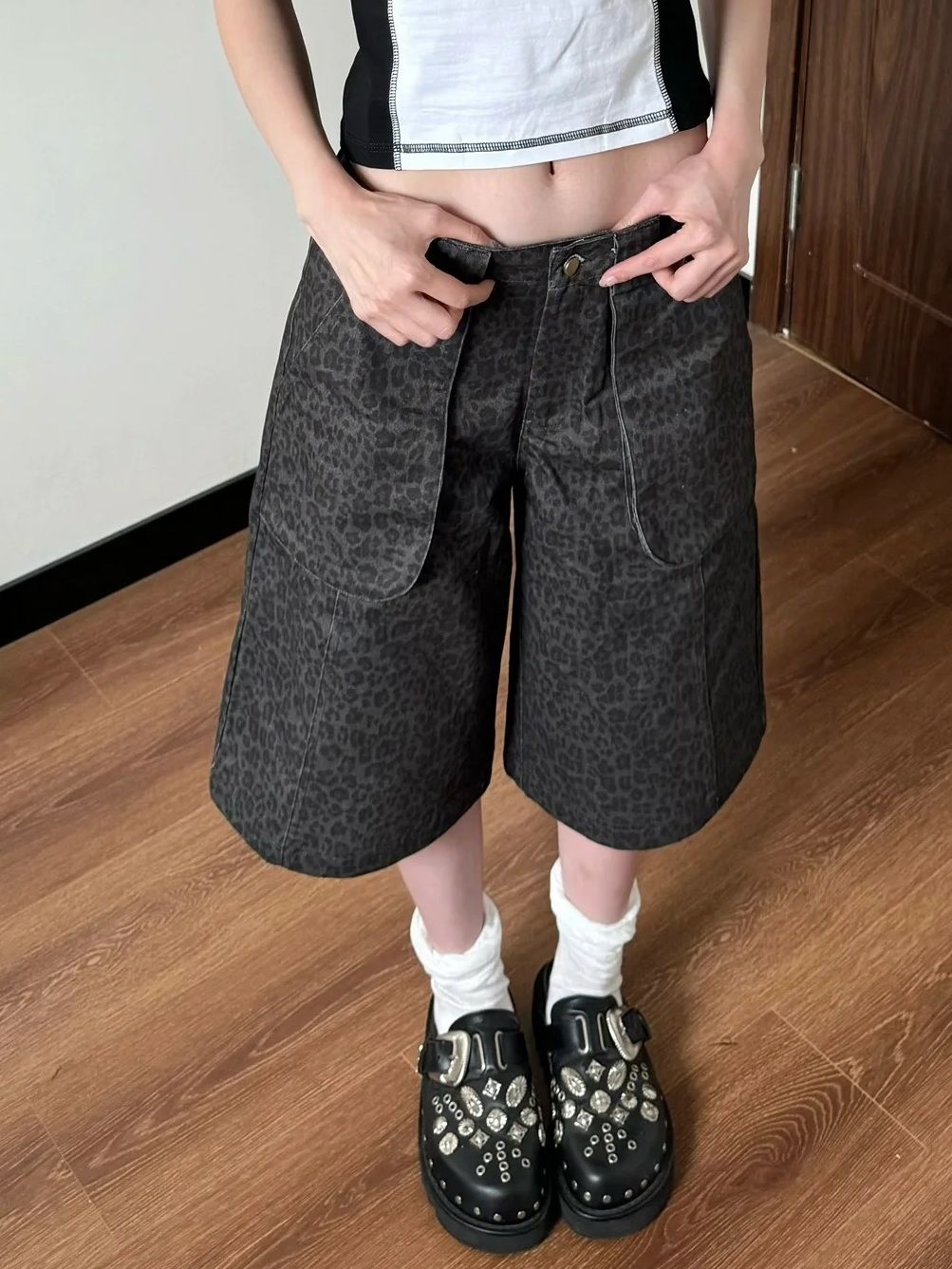 Vintage Leopard Print Denim Shorts - Y2K Cargo Capri Pants Women's High Waisted Wide Leg 7/5 Length