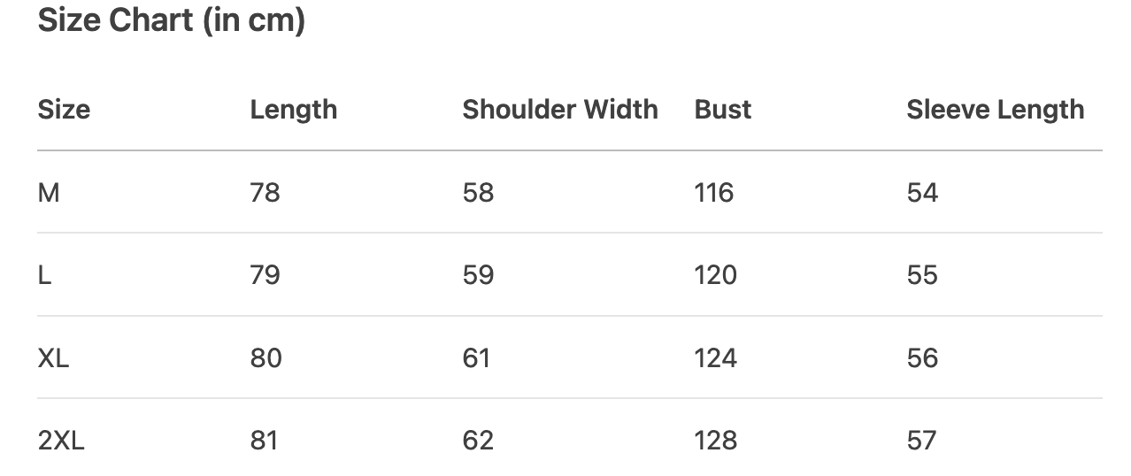 Every product page includes a detailed size chart for accurate measurements.