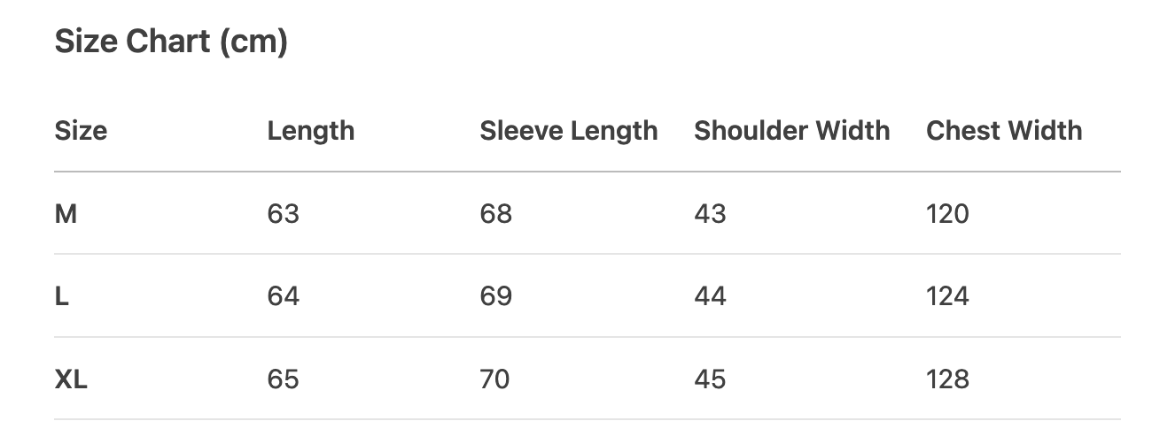 Every product page includes a detailed size chart for accurate measurements.