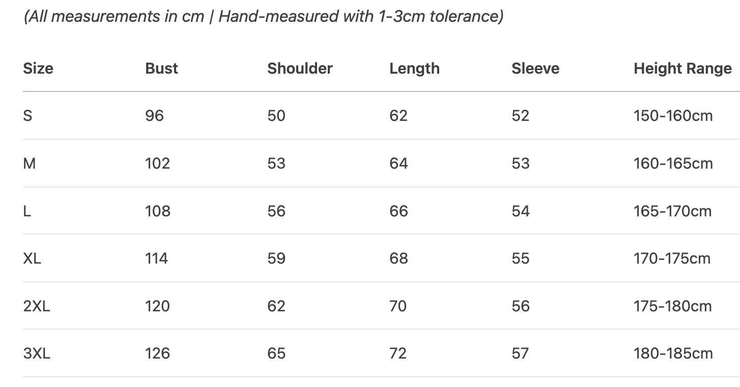 Every product page includes a detailed size chart for accurate measurements.