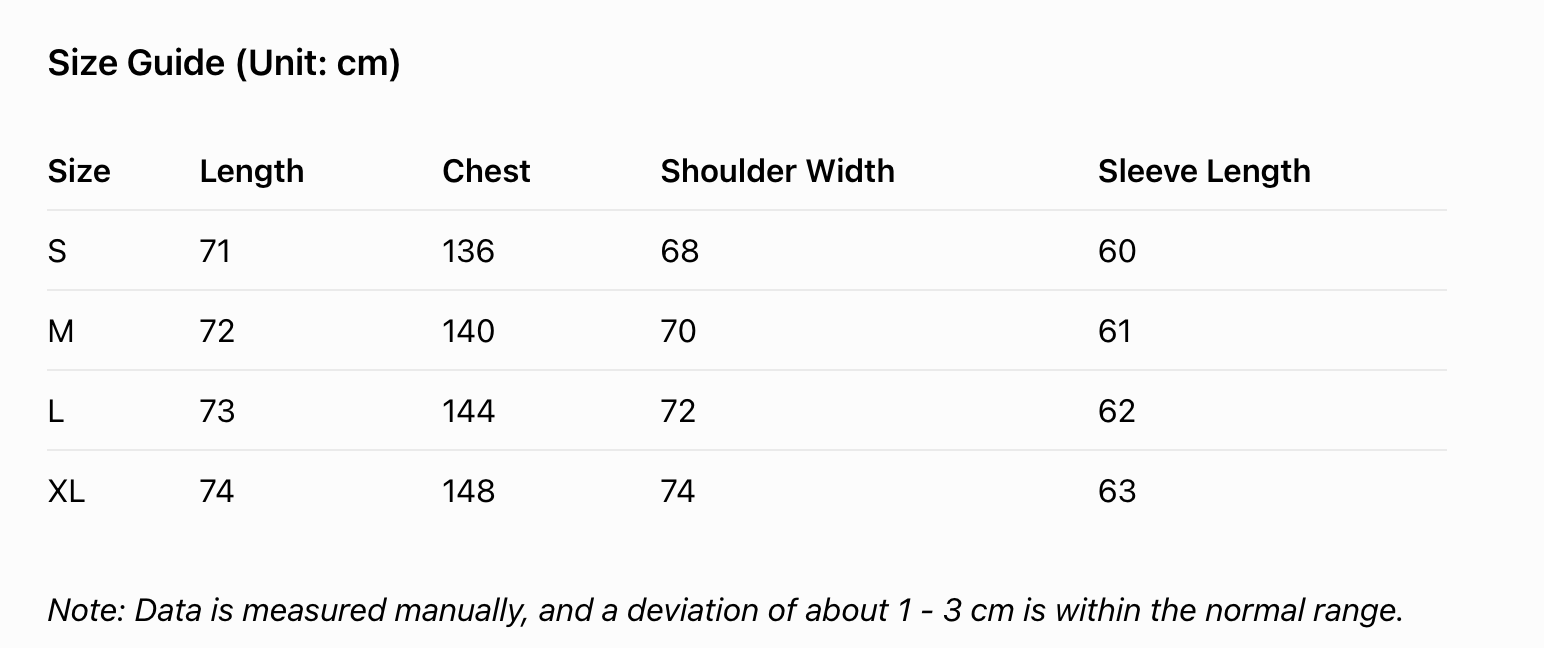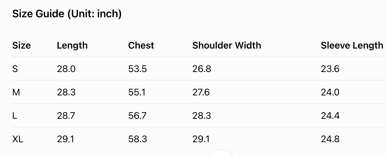 Every product page includes a detailed size chart for accurate measurements.