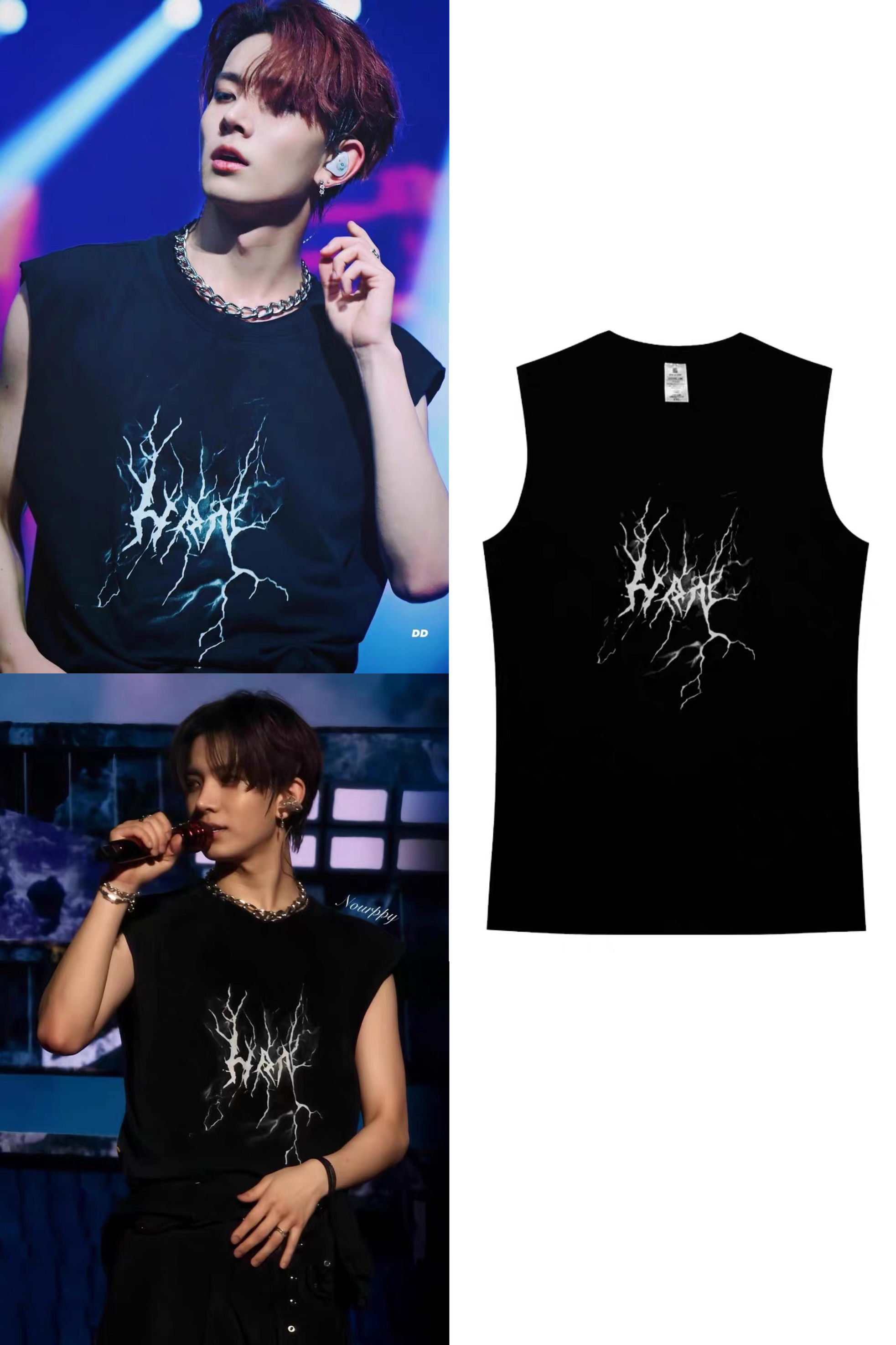 • Design: A black sleeveless vest with striking white lightning - shaped patterns and prints, similar to what ENHYPEN's Heeseung wears. The minimalist white background makes the design stand out.