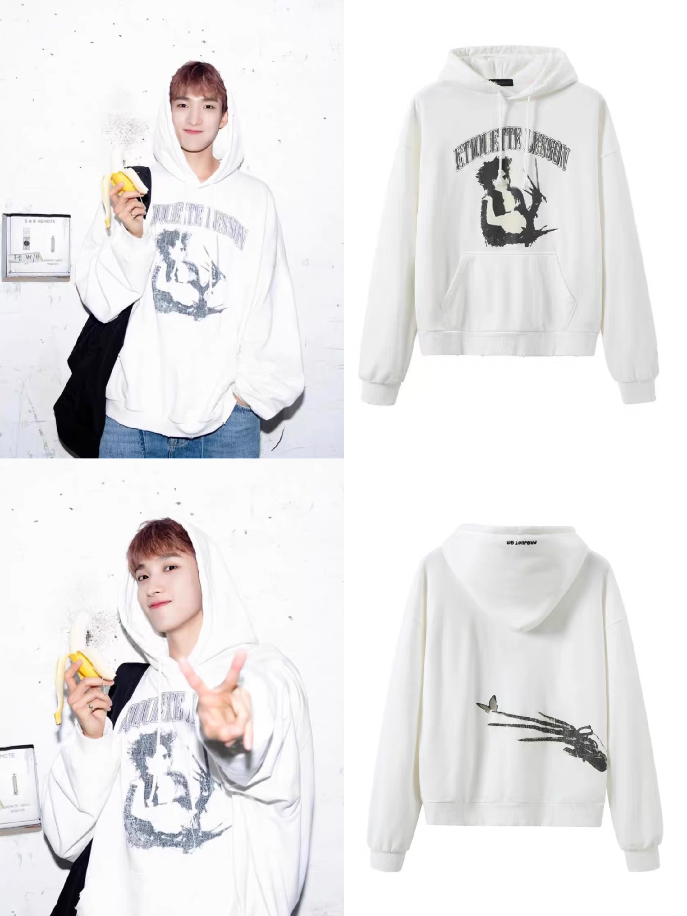 Design: Cop SEVENTEEN DK’s look with this white hoodie, featuring the same edgy graphic print.