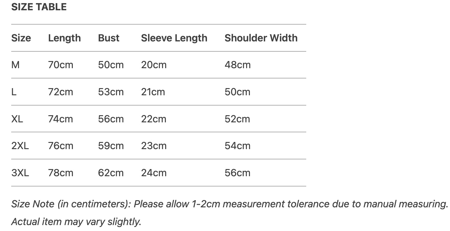 Every product page includes a detailed size chart for accurate measurements.