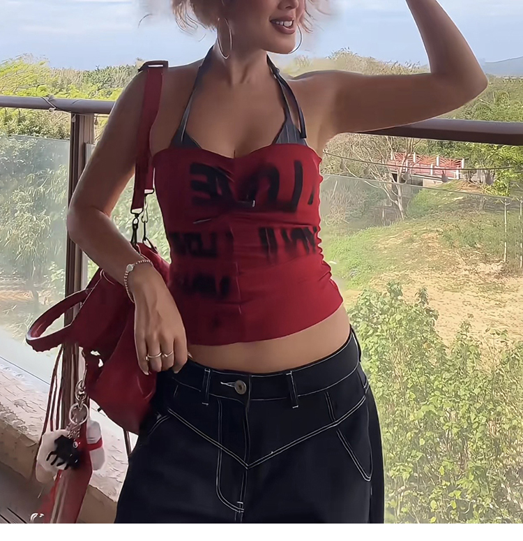 Y2K Avril Lavigne Style Letter Print Halter Neck Tank Top - Vintage 2000s Grunge Strap Cami