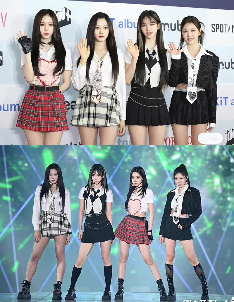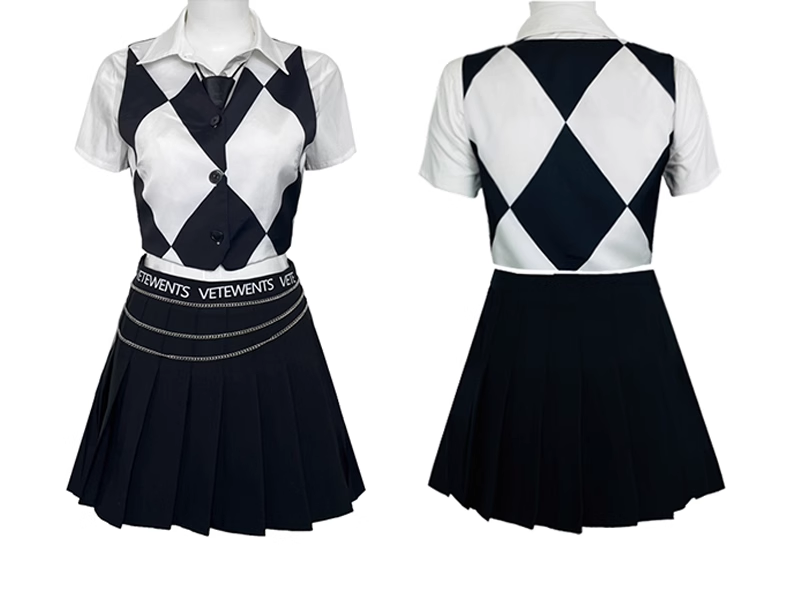• Precise Replication: Every detail, from the distinctive black - and - white argyle pattern on the vest to the sleek pleated skirt with chain embellishments, is faithfully reproduced to mirror Karina's look on stage.