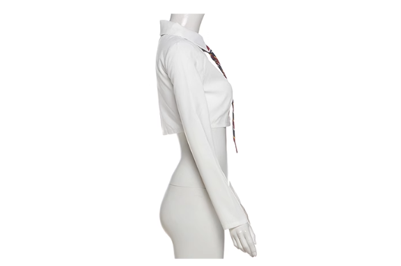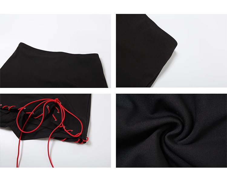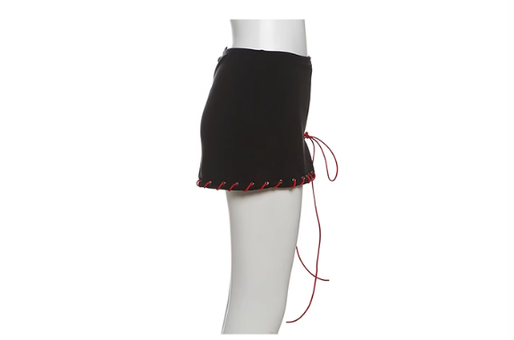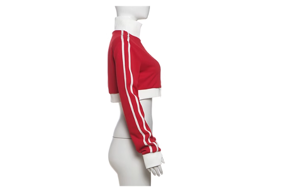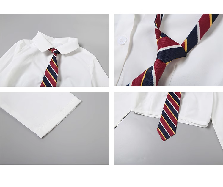 • Design: Red colorblocked jacket,  tie shirt, skirt with stylish details, a blend of classic and modern