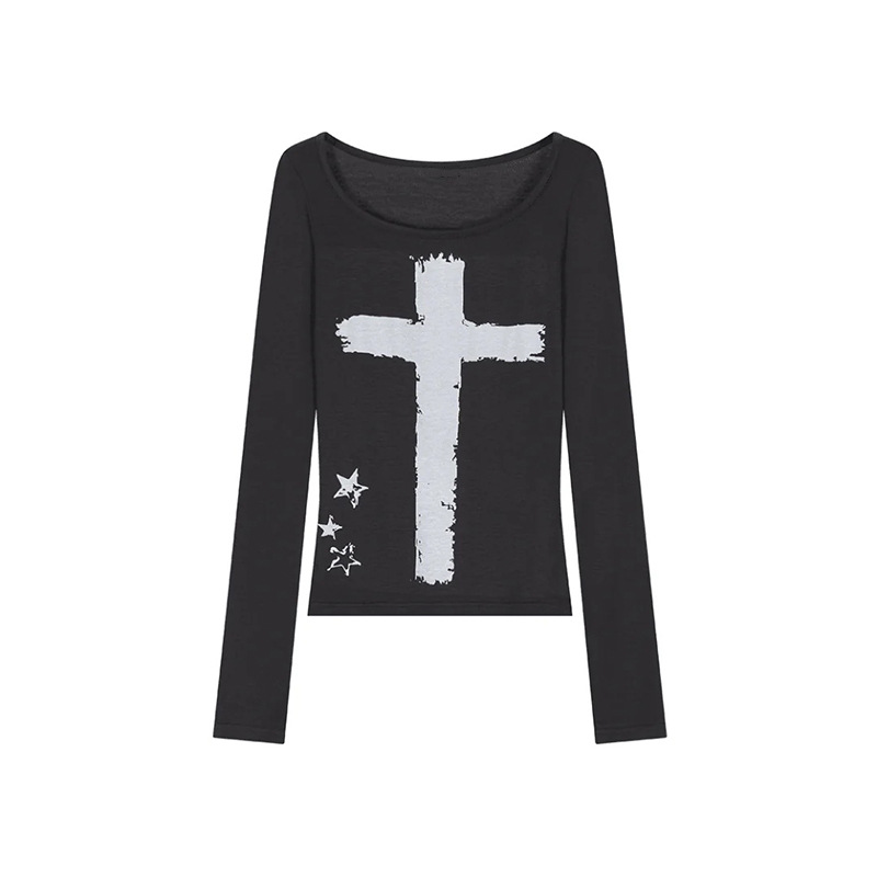 Fitted Long Sleeve Crew Neck T-shirt with Cross Print-Aespa Karina
