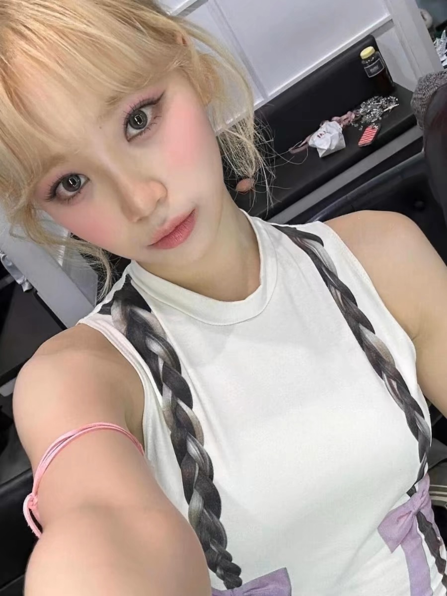 Elevate your style game with Chaewon's captivating stage look featuring the Braids Print Sleeveless Crop Top. This top is a perfect blend of playful and chic, with the charming braids and bow print adding a whimsical touch. Ideal for making a bold fashion statement, whether you're performing on stage or hitting the town. Embrace the energy of Lesserafim's fashion and let this crop top be the show-stopper in your wardrobe. Step into the spotlight and shine bright just like Chaewon!