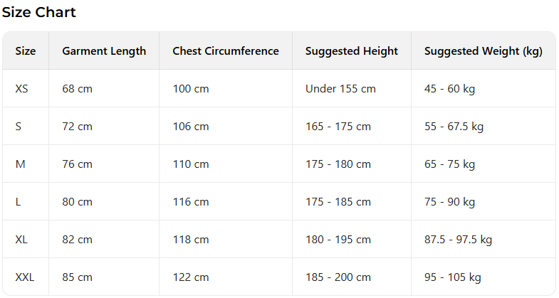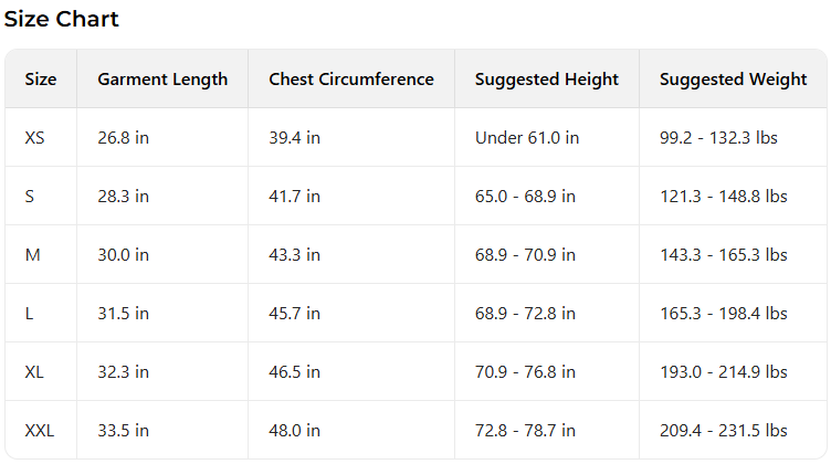 Every product page includes a detailed size chart for accurate measurements.