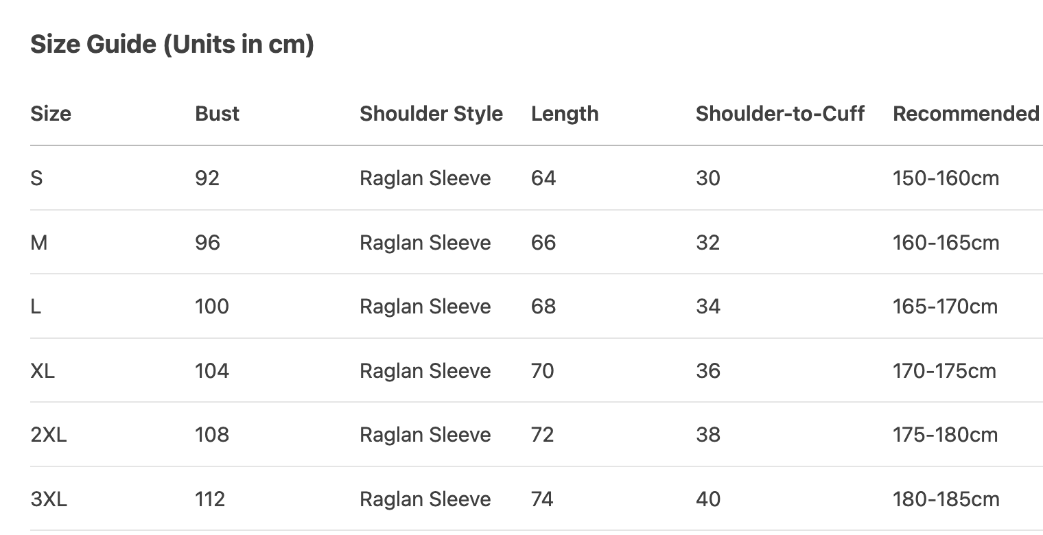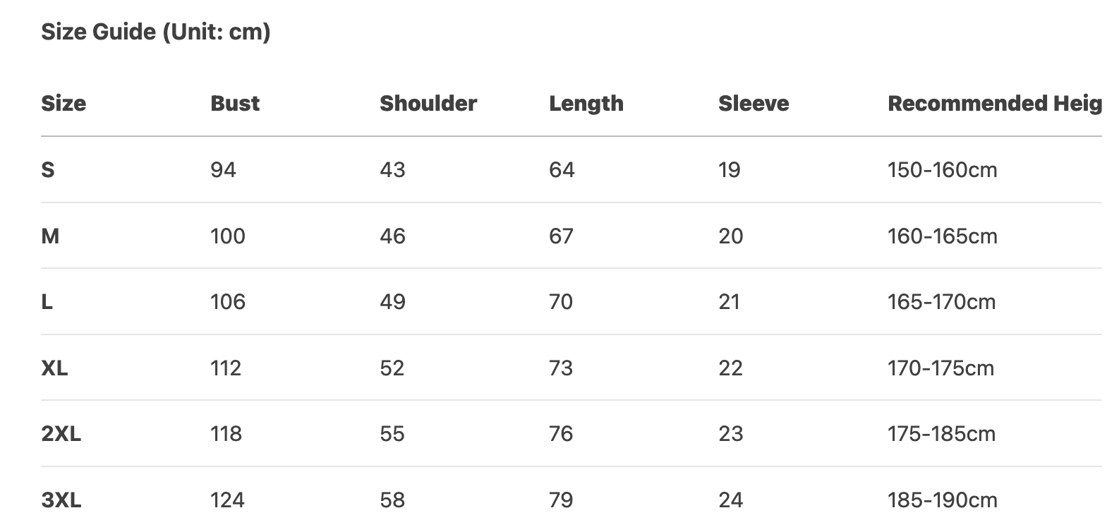 Every product page includes a detailed size chart for accurate measurements.