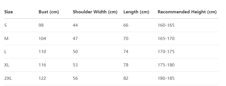 Every product page includes a detailed size chart for accurate measurements.