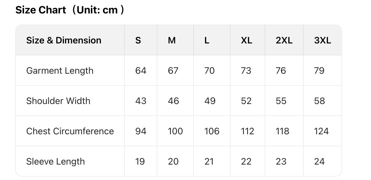 Note: Due to different manual measurement methods, a size error of 1 - 3 cm is within a reasonable range.