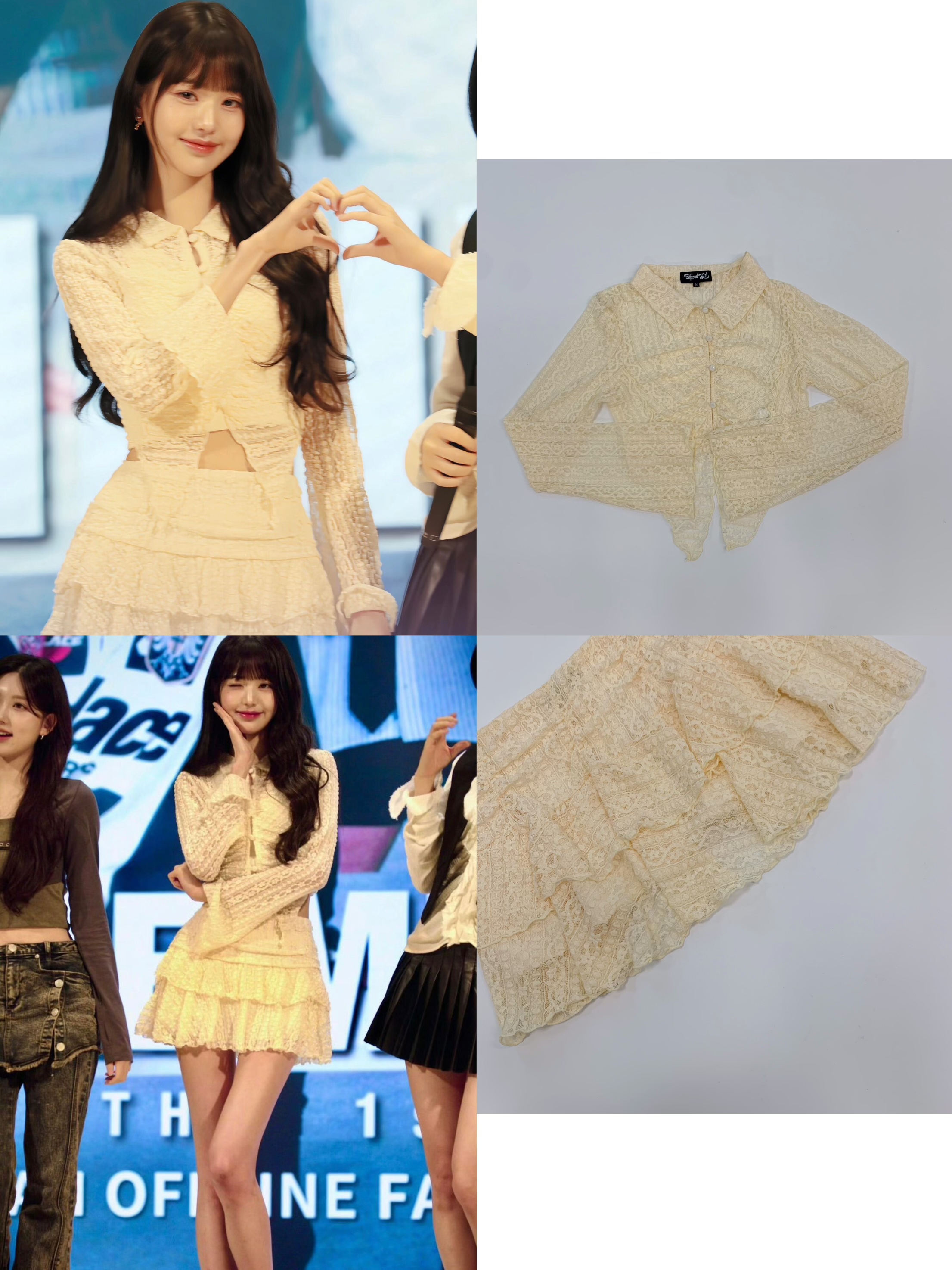Slip into IVE Wonyoung’s sweet stage style! This cream-colored lace set includes a cropped shirt with sheer sleeves and a tiered mini skirt. Delicate patterns add a dreamy, feminine touch. Perfect for Kpop-inspired looks—grab yours to shine like her!